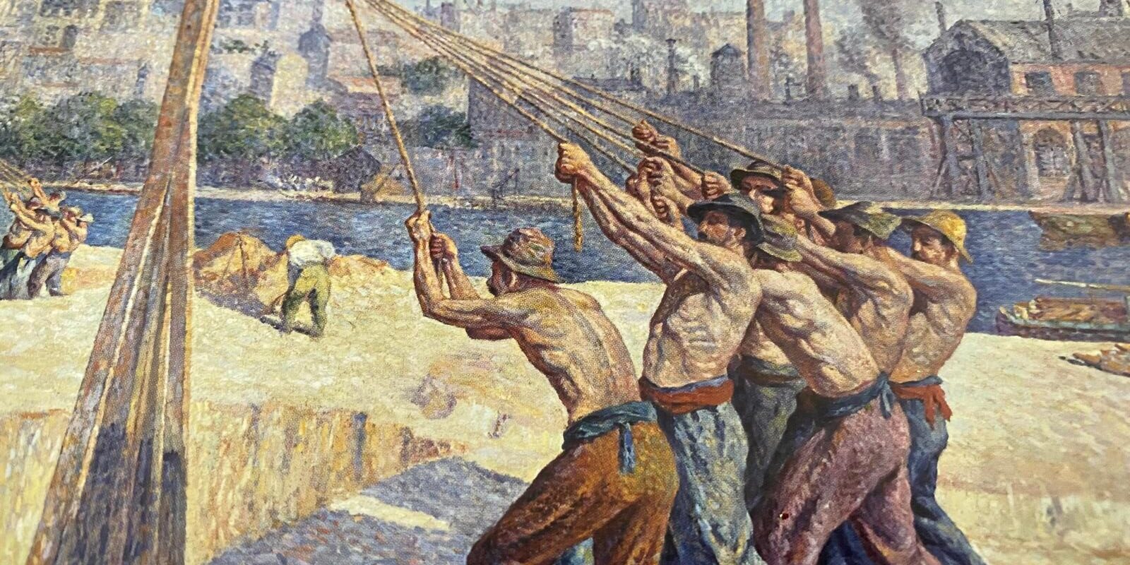 Maximilien Luce dipinge i cantieri edili della grande espansione di Parigi, le vampate notturne degli altiforni della siderurgia, l’orizzonte spezzettato dalle ciminiere, gli operai alle funi del battipalo, la prigione, gli uccisi dalla repressione.